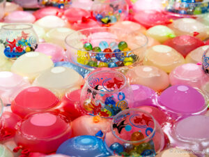 色とりどりの水風船、水上で輝くビー玉とその入った器、どれを取ってもとても美しいですし、水のこの清涼感が、7月の真っ昼間の灼熱地獄の中で撮影している私にとっては、とても輝いて見えましたね(笑)😂