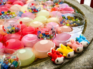 そして今回の主役である、おそらく陶器で作られているキンギョちゃんたちの置物ですが、こちらもとても可愛らしいデザインをしておりまして、カラフルな水風船の浮いている手水鉢のファンシーな雰囲気にピッタリな置物でございました!🥰