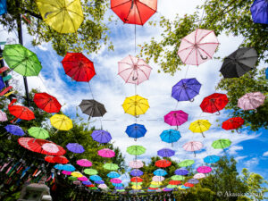 ついに平等寺で撮影した写真もこちらが最後の一枚でございまして、風鈴のトンネルを越えた先には実はもう一つ趣向が凝らされており、それがこちらの空に舞うパラソルたちでございます!⛱️