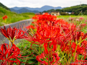 今回最後のヒガンバナのお写真はこちらでありまして、左側はアスファルトの道、右側は田んぼになっているのですが、その間のあぜ道に沿って整列して咲いているヒガンバナの花々を撮らせて頂きました!🌸