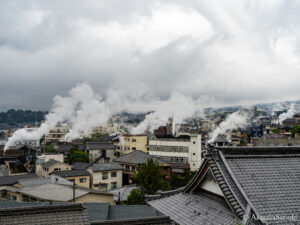 あいにく空は曇っており、晴天下での撮影とはいかなかったものの、しかし鉄輪の市街地の各地から昇ってくる湯煙が、まるで空の雨雲に吸い込まれているような、あるいは湯煙が雨雲を作っているかのような光景を撮ることができましたので、私としては満足する画を撮ることができました!😁
