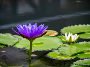 ちなみにこれは後日調べて分かったことなのですが、日本でよく見られる温帯性スイレンにも熱帯性スイレンと同様、赤や白、ピンクや黄色といった花があるようですが、写真の花のような青や紫といった寒色系の色の花は温帯性スイレンには見られないそうで、熱帯性スイレンのみが咲かせる色の花なのだそうです。