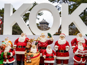 そんなサンタクロースが多数立ち並ぶ中で、「KOKURA」の文字のオブジェの中の「O」の字の穴の部分から、なんと小倉城の天守閣が丁度見えるようになっていることを発見しまして、小倉城の天守閣を中心に、サンタクロースたちが並んで記念撮影をしているようなイメージで、こちらの写真を撮らせて頂きました!📸✨️