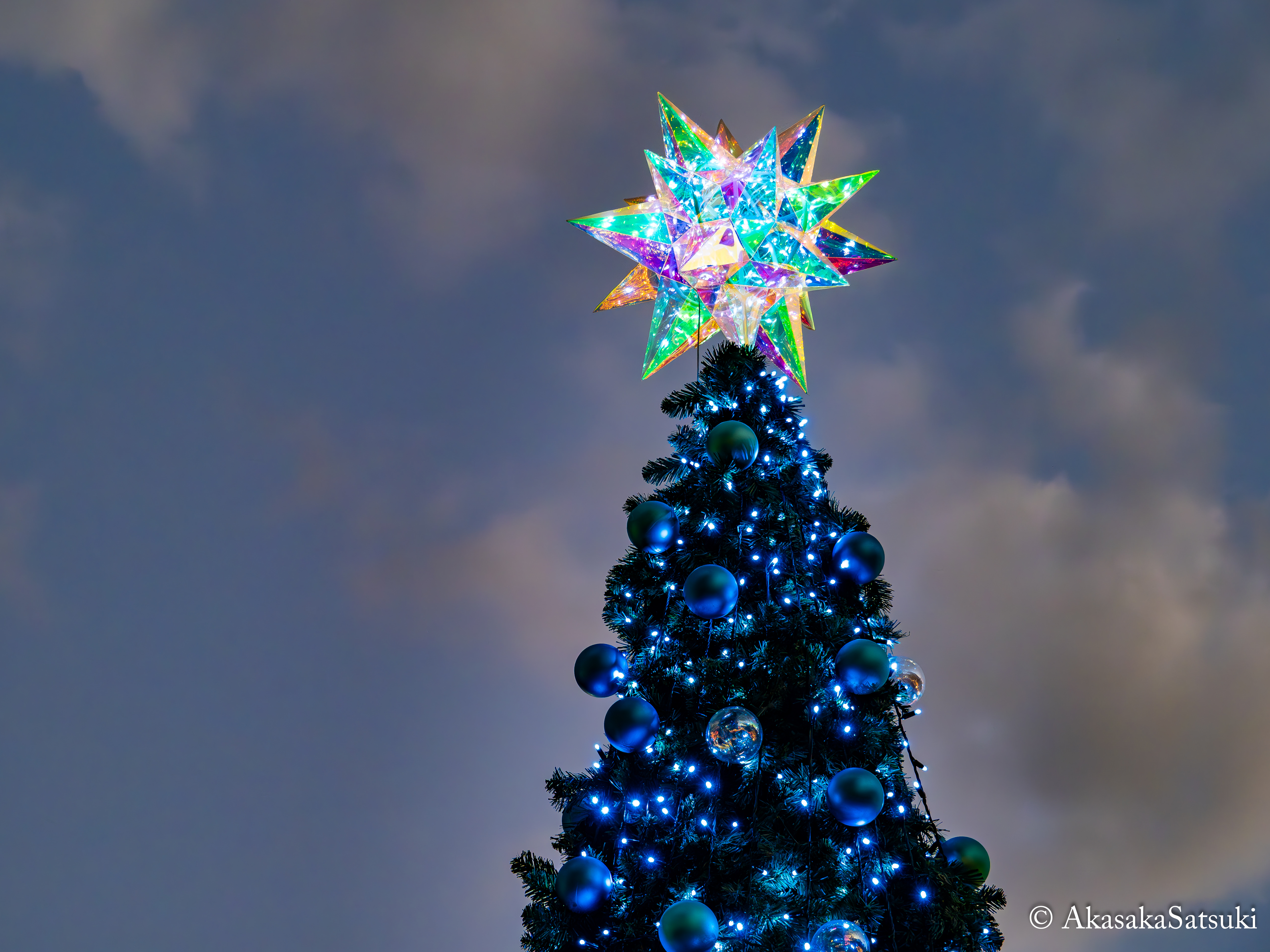 昨年のクリスマス頃、本Photoblogではクリスマス特集2025という枠組みを組んで、小倉クリスマスマーケットで撮影した写真を一部先出ししたのですが、その中に紫川親水広場にて撮影した、青いオーナメントと青い電飾に包まれた、青色で統一されたクリスマスツリーの写真を掲載したのですが、今回の写真は、そんな青色のクリスマスツリーのテッペンで輝いていた、プリズム状の星をピックアップして撮った写真でございます!🌟
