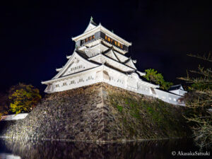 紫川河川敷のイルミネーションや小倉クリスマスマーケットの様子の写真も撮り終え、そろそろ引き上げようと思い最後に立ち寄った場所は小倉城でありまして、お城の下からスポットライトで照らされて、夜闇に浮かぶ石垣と天守閣の姿がこれまたなんとも美しかったので、一枚撮らせて頂きました!📸✨🏯