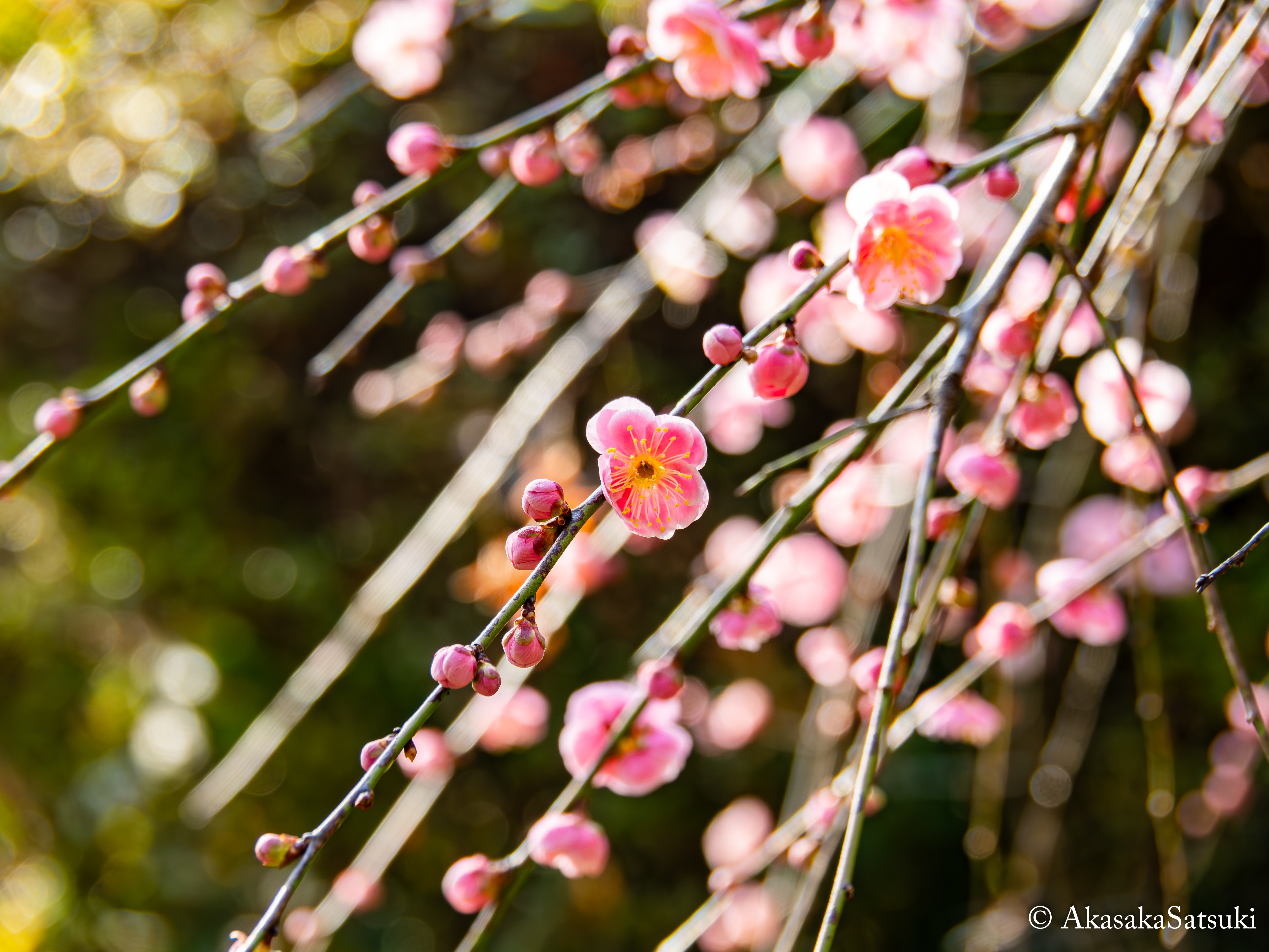 赤や白やピンク色など、多彩な色の花を咲かせる梅の木でございますが、観賞用の梅として特に人気があるのがこちらの枝が垂れた枝垂れの梅の木でございまして、今回私が撮影に選んだ枝垂れ梅はちょっと日当たりの悪い場所にあるためか、開花が少し遅れており、まるで米菓のあられのようにぷっくらと膨らんだ蕾が多い木だったのですが、その中でも先陣を切って咲いていた数輪のピンク色の若い花が、形も色味もしっかりとしていて、なんとも綺麗な姿で咲いておりましたので、今回の春先特集10枚目の写真とさせて頂きました!🌸