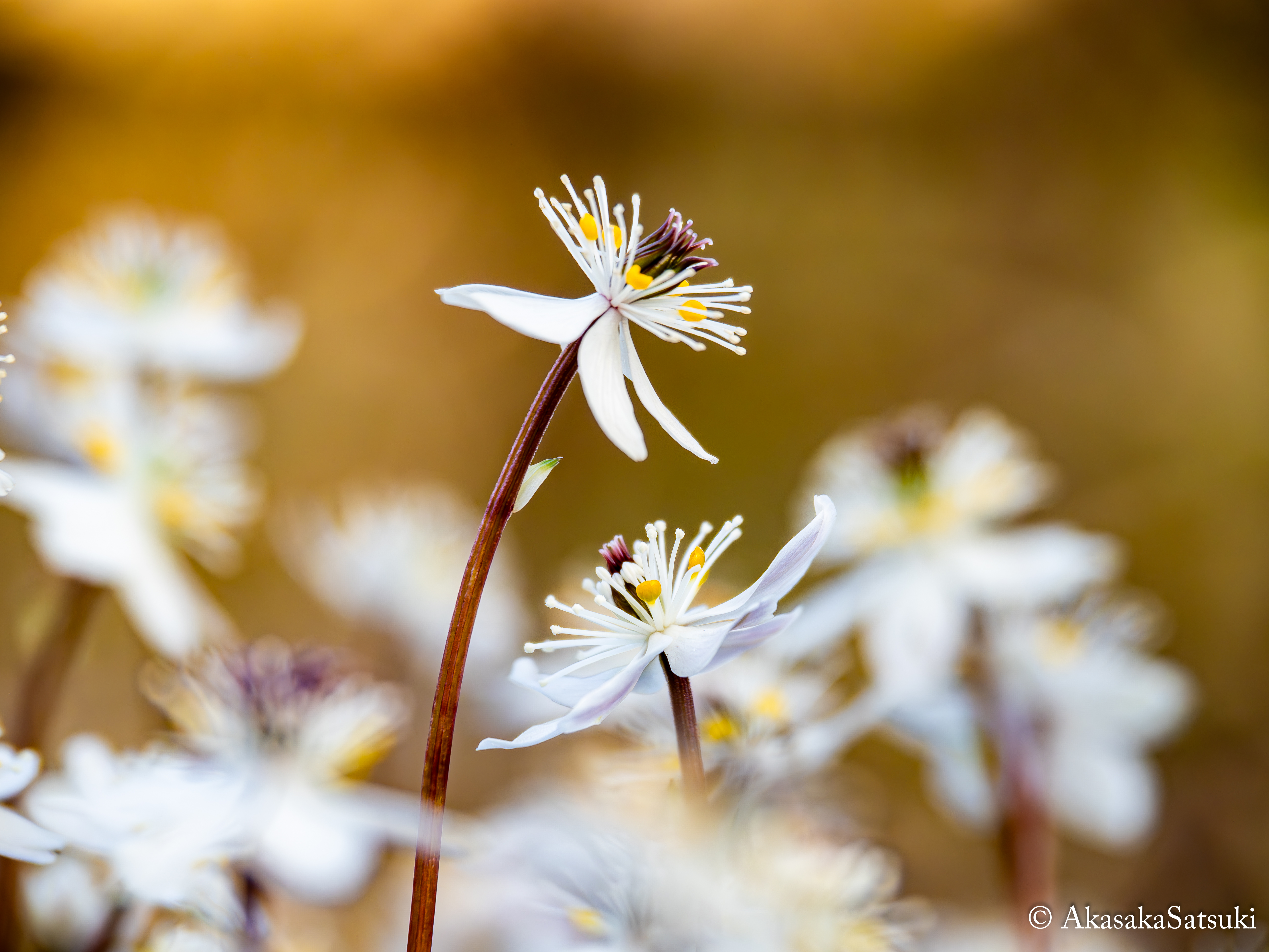 今回私が撮ったバイカオウレンは白野江植物公園内の鉢の中で栽培されていたものでございまして、鉢の中で複数群生していたバイカオウレンの一輪一輪をよく見ていると、その中に互いに寄り添い合っているように見える二輪の花を見つけまして、バイカオウレンの花言葉には恋愛に関する事柄が多いことにちなんで、この二輪の花を二人の男女に見立てて、このようなタイトルを着けさせて頂きました!🧑🤝🧑