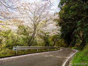 昭和池の周りを歩いて一周している最中に見つけたのが、山間の曲がり道沿いに花を咲かせる大きな桜の木でございまして、散った花びらが簡素な道路を淡い桜色に彩っておりましたので、その風景を一枚撮らせて頂きました!🌸